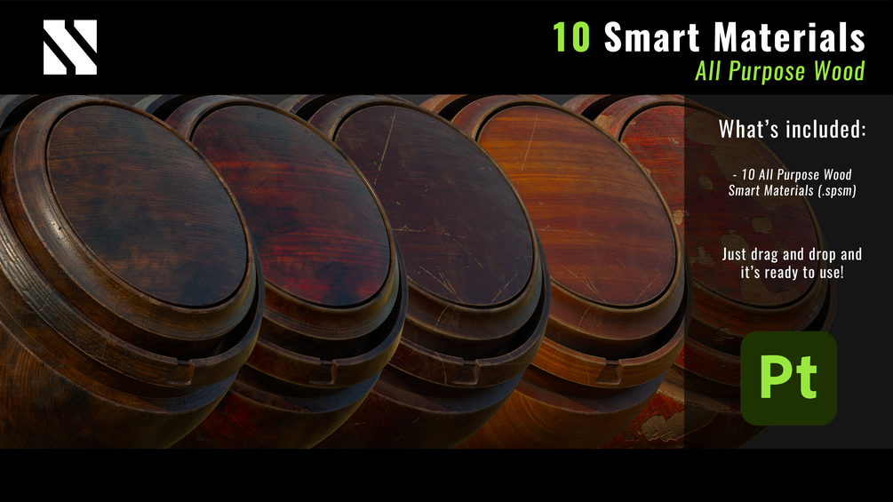 A set of 10 All Purpose Wood for Substance Painter for texturing all kinds of wood materials.